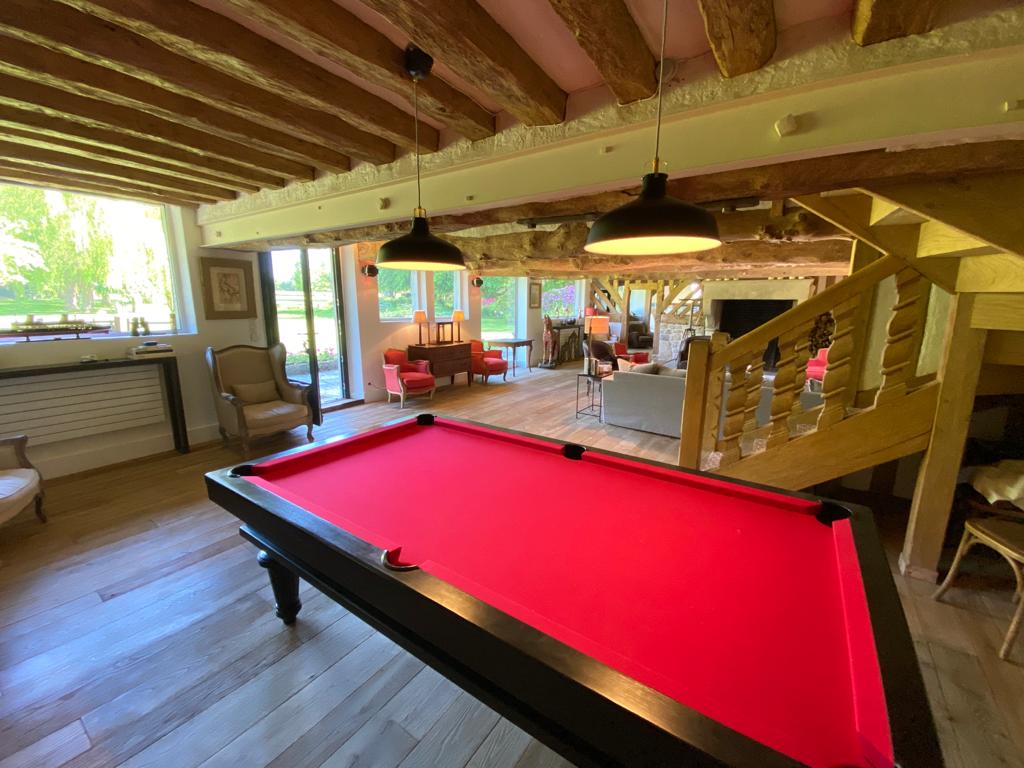La maison ouvre sur une très belle cuisine équipée faisant office de salle à manger, un très beau salon avec billard et cheminée, ouvrant sur le parc, un bureau, petit salon de lecture, ainsi qu’une chambre et une salle de bains.