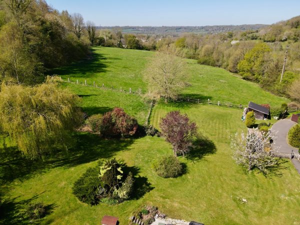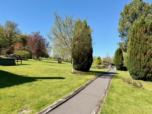 Le jardin paysager profite d’un dégagement sur la campagne vallonnée, ainsi qu’un herbage pouvant accueillir des chevaux.