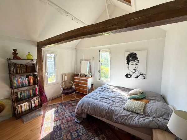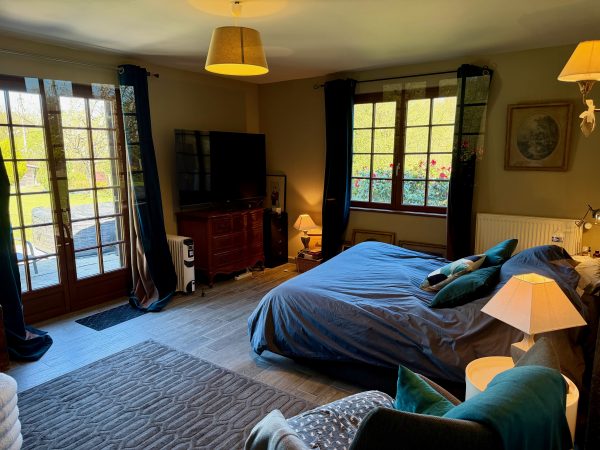 La dépendance accueille un salon et une salle de douche au rez-de-chaussée, à l’étage, deux chambres communicantes et un balcon profitant d’une jolie vue.