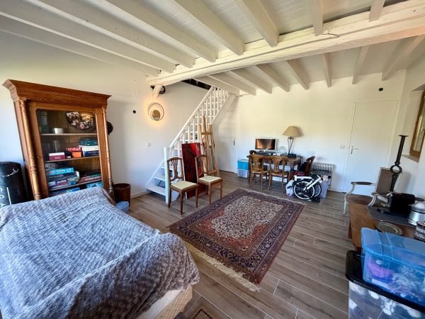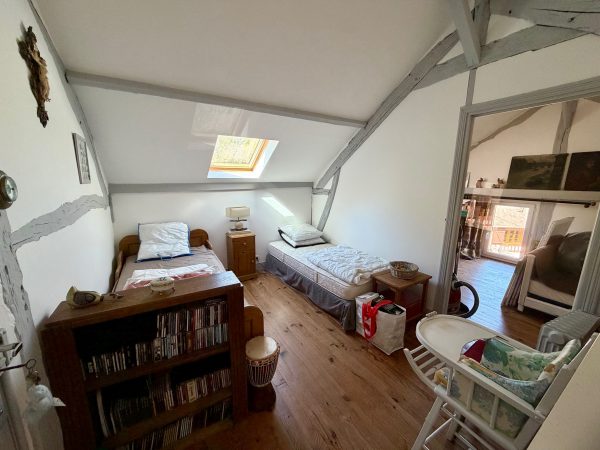 La maison s’ouvre sur une cuisine aménagée et équipée, un séjour avec sa cheminée, une grande chambre donnant accès à une terrasse et une salle de douche. À l’étage, le palier dessert deux chambres dont une avec mezzanine sous combles.