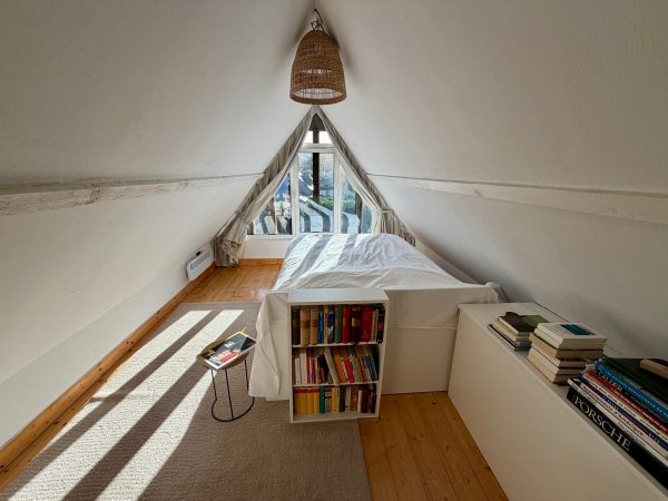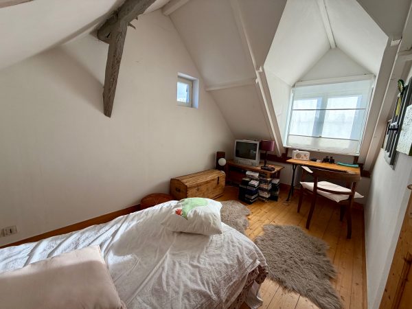 À l’étage, un palier pouvant faire office de bureau, une salle de bains et une chambre sous mansardes avec vue sur la campagne. Ainsi qu’une troisième chambre au deuxième étage.