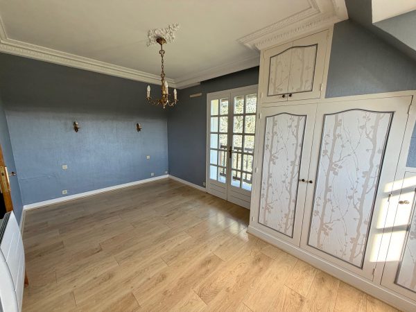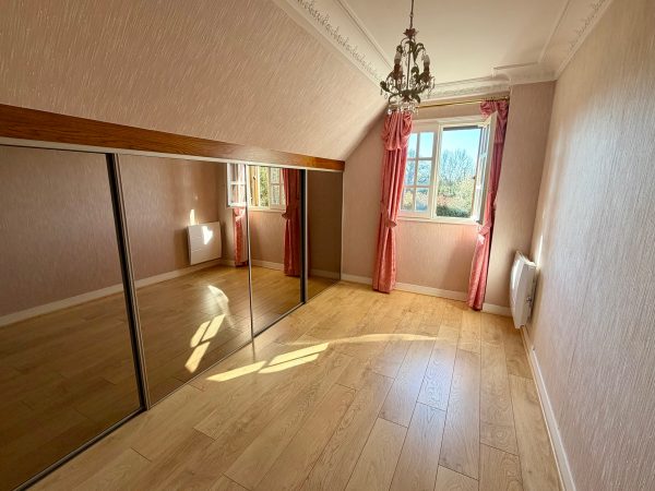 À l’étage, le palier dessert deux chambres avec placards, une salle de douche, ainsi qu’une troisième chambre bénéficiant de son propre balcon.
